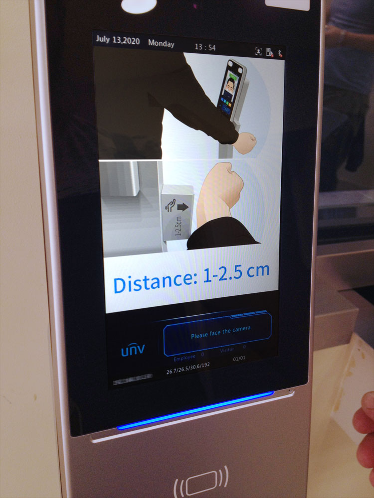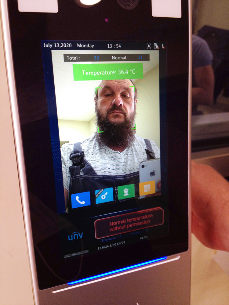 Измерение температуры производится бесконтактным инфракрасным термометром по запястью на расстоянии от 1 до 4 сантиметров. Данная модель обеспечивает точность до 0,1°С.Для удобства пользователей внесение руки в зону измерения сопровождается звуковым сигналом — это позволяет существенно снизить затраты времени на одного тестируемого. Если результат замера выходит за рамки предварительного диапазона значений, терминал генерирует тревожное событие и соответствующие аудиовизуальные оповещения. Результат измерения может быть использован в качестве одного из критериев допуска наряду с результатом распознавания лиц, предъявлением карты либо QR-кода. Система автоматически определяет наличие на лице маски — это также может быть использовано как критерий допуска для испытуемых, прошедших температурных контроль. В случае отрицательного результата терминал оповещает пользователя о необходимости надеть маску.