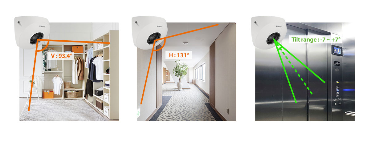 В устройстве Wisenet TNV-8010C использована широкоугольная оптика, а камерную головку при установке можно отрегулировать по углу наклона в диапазоне ±7°. При необходимости пользователь может включить «коридорный» режим — портретную ориентацию транслируемых камерой изображений. Вертикальное изображение может формироваться и с соотношением сторон 9:16; в данном случае общее разрешение изображения снижается до 2 мегапикселов, но из картинки исключаются зоны, не содержащие полезной информации. Это позволяет существенно сэкономить битрейт.