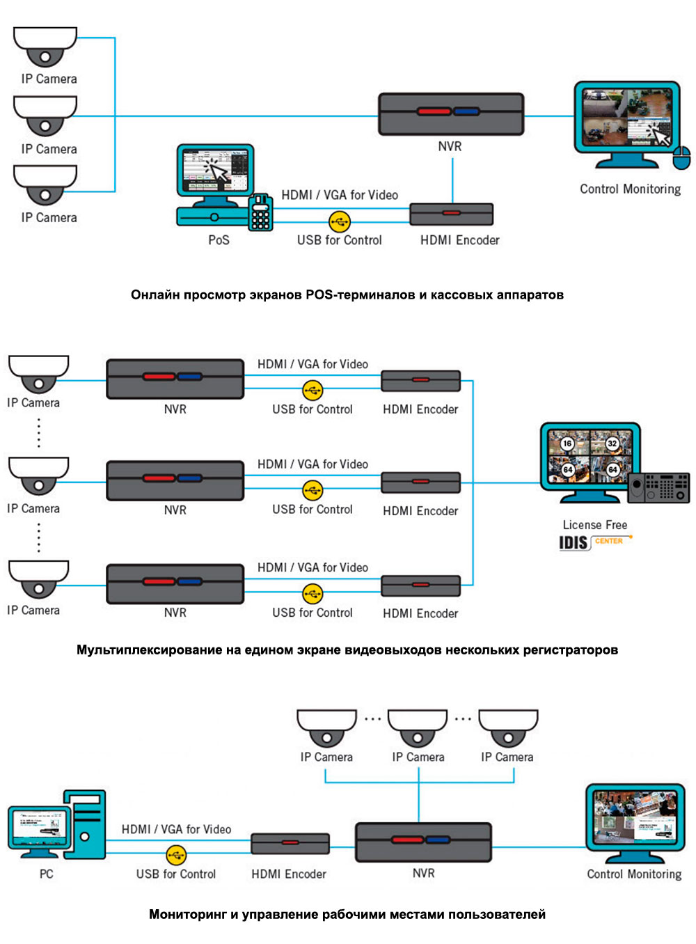 Решения на базе энкодера IDIS HE-1101 производитель рекомендует к применению в ситуационных центрах и на постах управления распределёнными системами, где устройство используется в качестве компонента интеллектуальной системы управления видеостенами IDIS IWS (Intelligent Wall Solution). Отображение и запись видеоданных с мониторов исходной системы могут сопровождаться управлением этой системой через интерфейс удалённого рабочего стола. Это позволяет обеспечить максимально безопасный доступ к управлению системой.