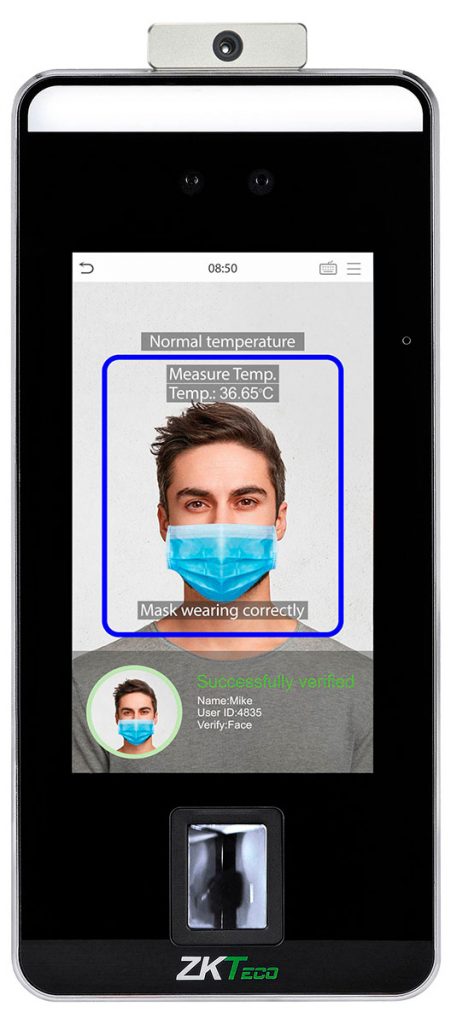 Терминалы серии SpeedFace-V5L[TD] хранят во встроенной памяти до десяти тысяч пользовательских учётных записей, обеспечивая, помимо бесконтактного распознавания, контроль температуры тела и определение ношения защитной медицинской маски. Интеллектуальная защита от попыток вмешательства в работу устройства надёжно предотвращает попытки «подсунуть» терминалу вместо живого лица распечатанную картинку либо видеоизображение с планшета. Помимо биометрии, терминал поддерживает и ввод пароля с клавиатуры.
