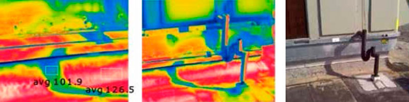На иллюстрации вверху — пример того, как следует интерпретировать тепловизионное изображение, полученное в ходе термографической инспекции крышного кондиционера. На левой картинке хорошо различима зона в виде полосы, температура которой более чем на 10°С ниже фона. Центральная картинка, снятая более общим планом, позволяет предположить, что эта полоса — тень от конденсатной трубы. Это подтверждается телевизионным изображением справа, на котором также видно, что сама труба обмотана изолентой для снижения отражений. Распределение температур по поверхности станины выглядит несколько хаотичным, как всегда происходит с блестящими металлическими поверхностями — это влияние отражений, которое можно либо проигнорировать, либо, при необходимости получить реальную картину, оклеить матовым материалом. А вот на окрашенном металлическом корпусе самого моноблока распределение температур выглядит более равномерным.