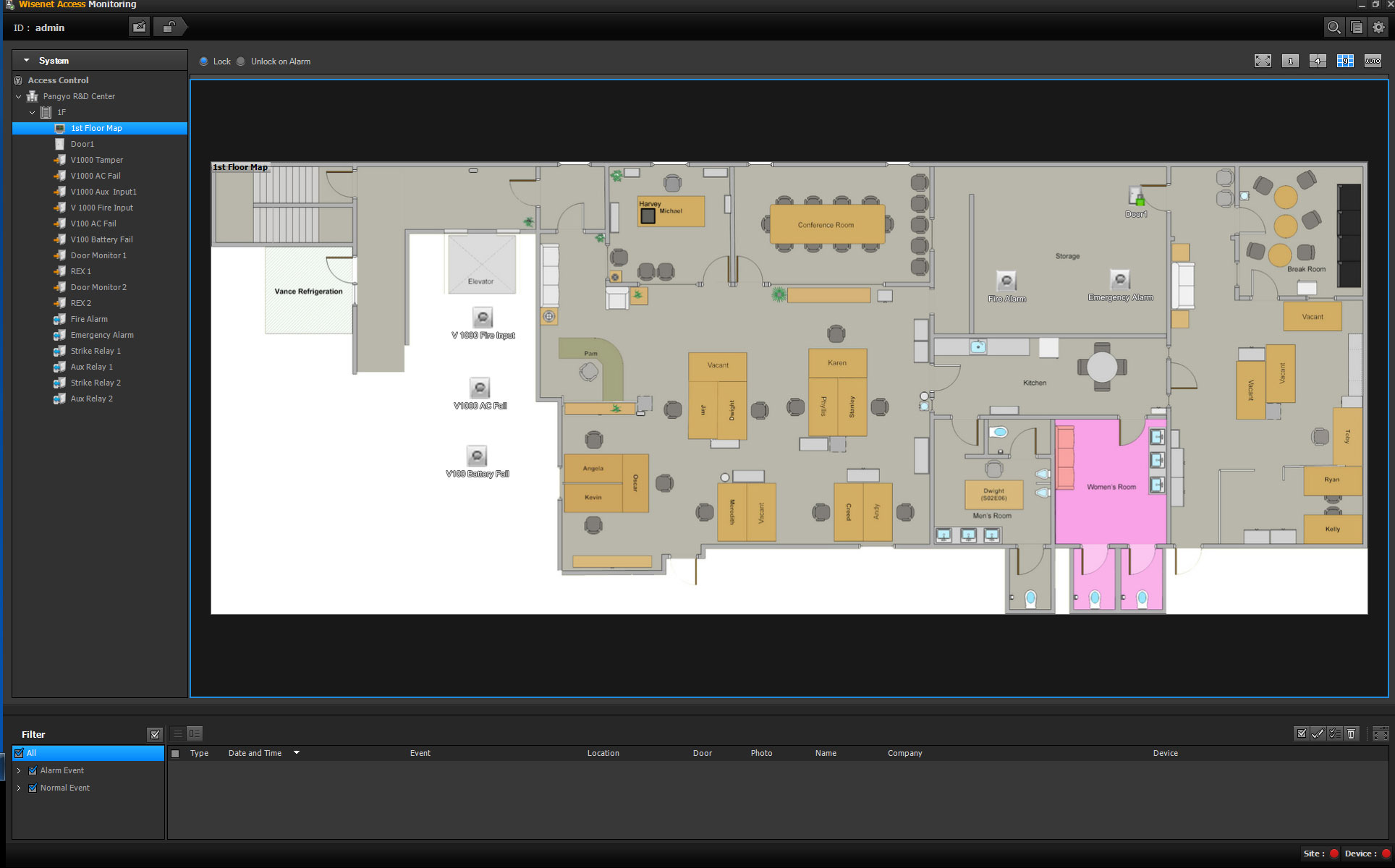 Система интегрируется с платформами видеонаблюдения Hanwha — Wisenet Wave и SSM, обеспечивая операторам удобный и наглядный интерфейс. Через него можно контролировать доступ, получать видеоподтверждение событий, управлять релейными выходами, открывать или блокировать двери и сбрасывать тревоги. Одним нажатием оператор получает доступ к информации о входе, включая имя пользователя, время и точку доступа, сопровождаемую видеокадром. Это особенно важно для ситуационной осведомлённости и последующего анализа инцидентов.