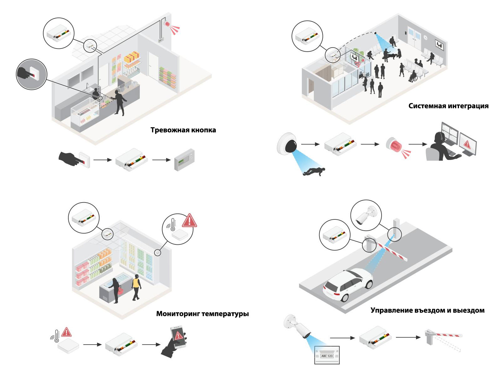 Этот модуль может использоваться для мониторинга входных сигналов с телекамер, аналитики, тревожных кнопок, датчиков окружающей среды и многого другого, а также для обнаружения системных событий и реагирования на них. Кроме того, основанный на открытых стандартах, он легко интегрируется со сторонними передовыми системами безопасности, такими как система видеоуправления (VMS) и охранная сигнализация.