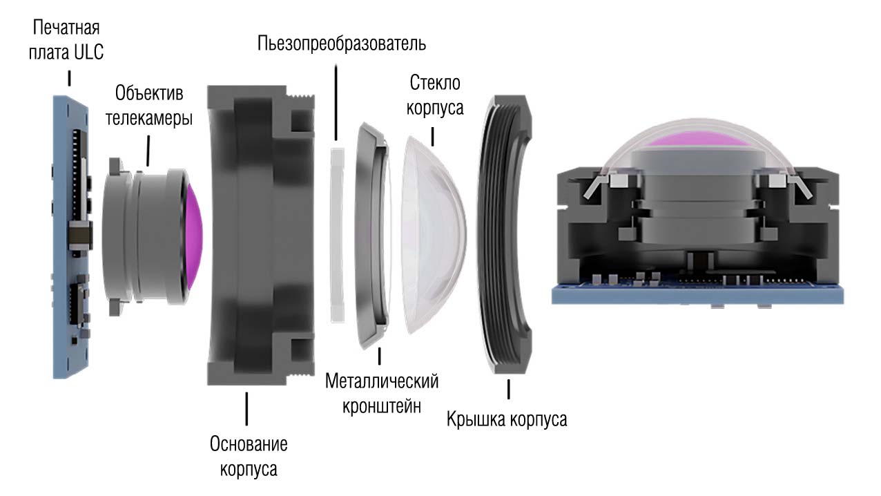 - Модульное решение для готовых камер. Представляет собой сменный блок оптического окна с уже закреплённым пьезоэлементом и компактной платой. Такой модуль можно устанавливать в существующие камеры при обслуживании или модернизации.