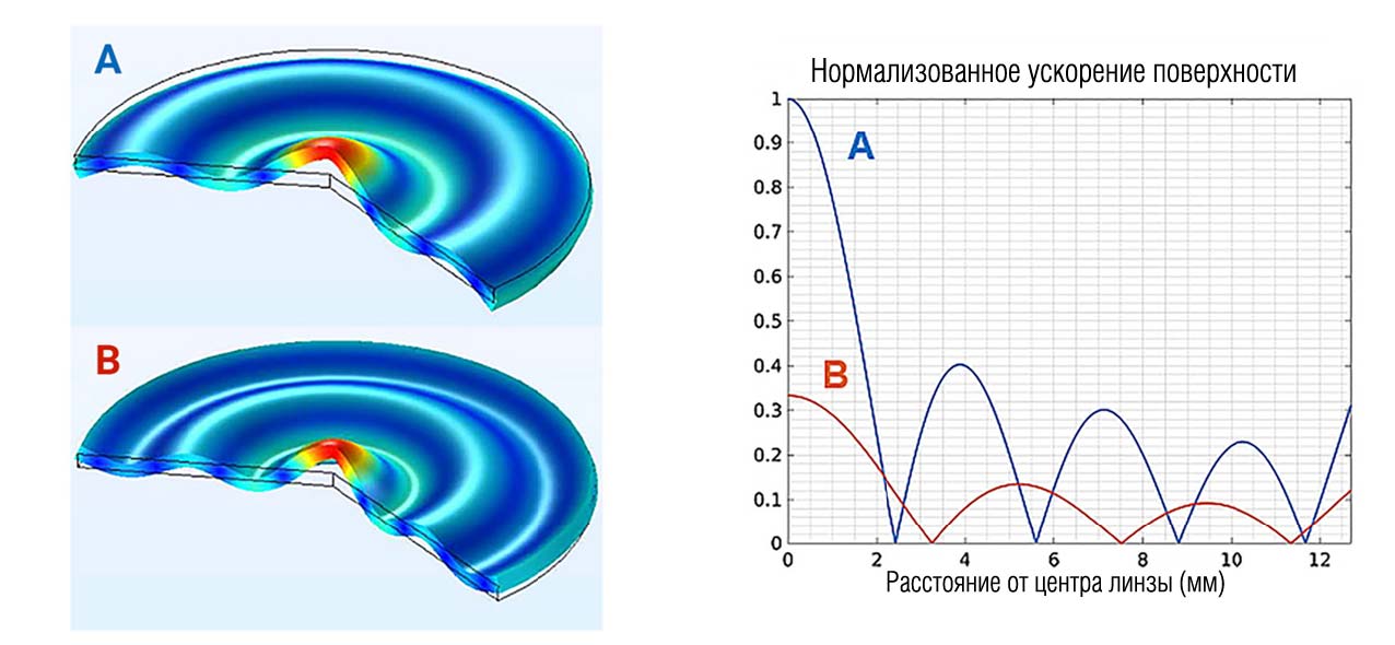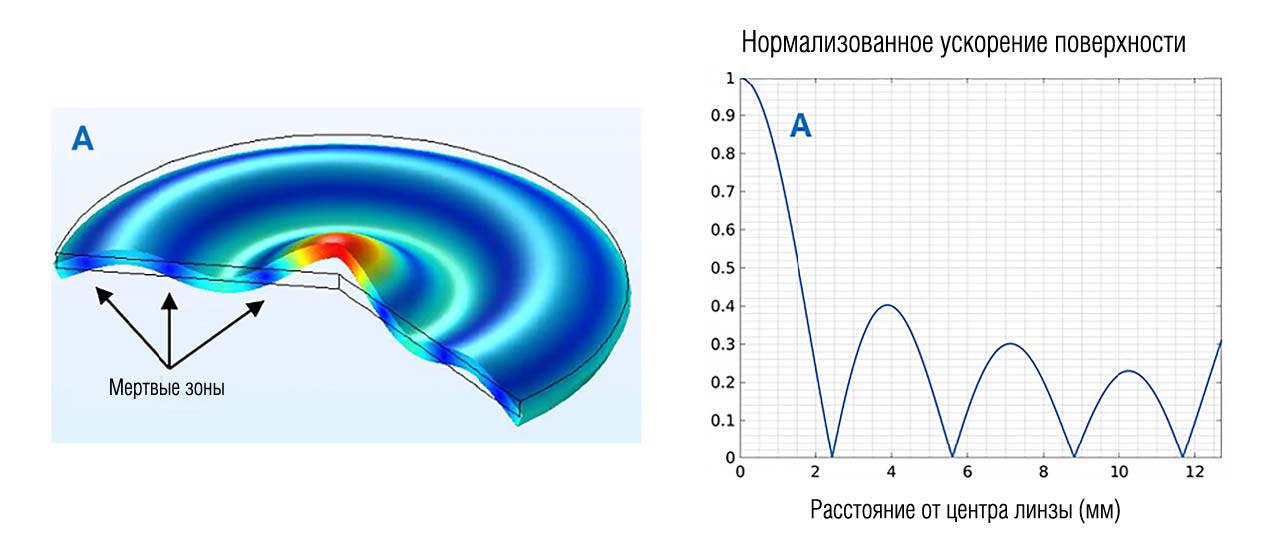 Самый простой способ реализации — возбуждение оптического окна на одной из его собственных частот с формированием стоячей волны, или моды. Для круглого стекла диаметром 10–40 мм и толщиной 0,5–2 мм рабочая частота обычно находится в диапазоне 20–100 кГц. Поскольку загрязнение меняет массу и упругость системы, резонансная частота немного смещается. Чтобы компенсировать этот эффект, в процессе очистки сигнал может плавно изменяться в небольшом диапазоне вокруг резонанса, например от 28 до 32 кГц при центральной частоте 30 кГц. Такой приём обеспечивает стабильную работу даже при изменении условий. Недостатком одномодового подхода является неравномерность ускорений по поверхности: в зонах с низкой амплитудой колебаний очистка менее эффективна, и на них может оставаться налёт. На моделировании это хорошо видно.